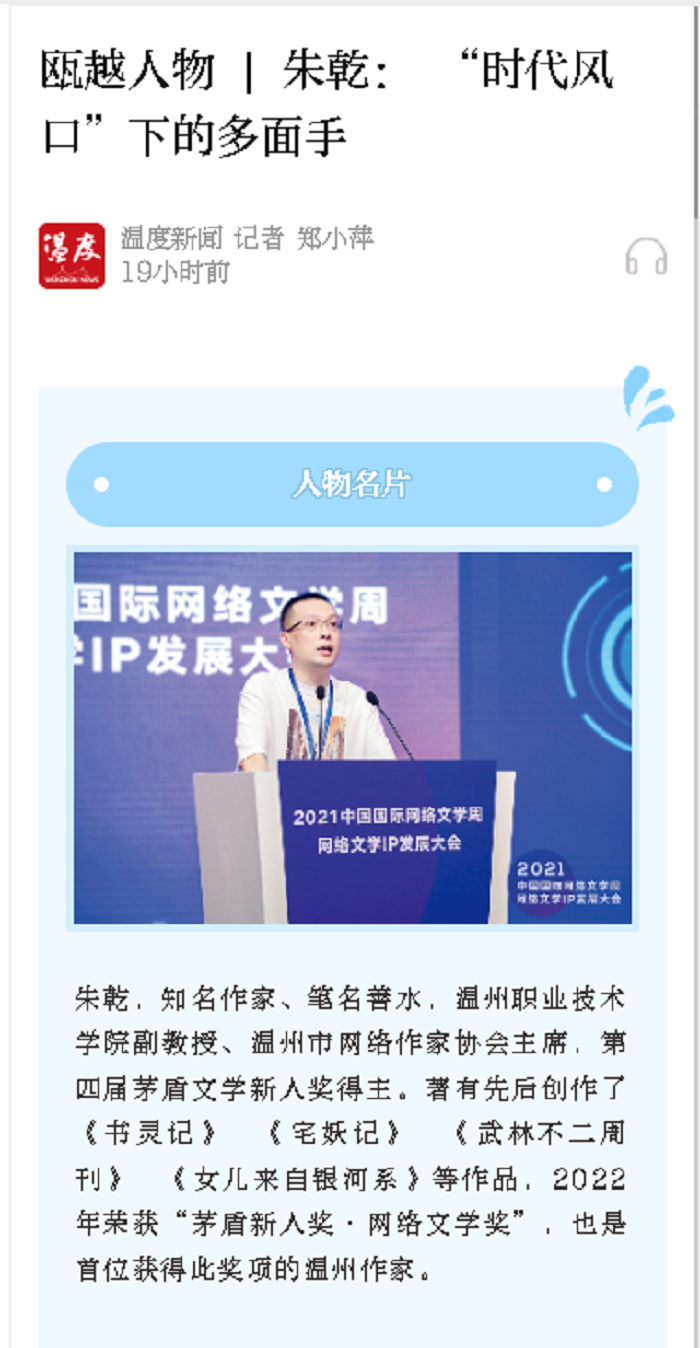 2022年,朱乾荣获“茅盾新人奖·网络文学奖”,是首位获得此奖项的温州作家。