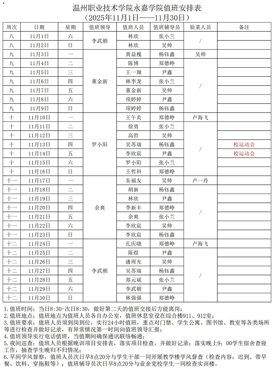 永嘉学院11月值班表(2025年11月1日-11月30日)