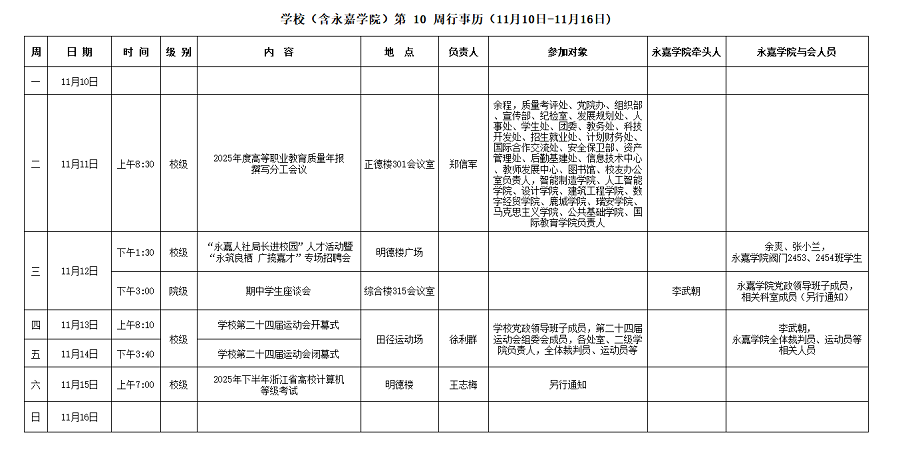 永嘉学院第10周行事历(11月10日-11月16日)
