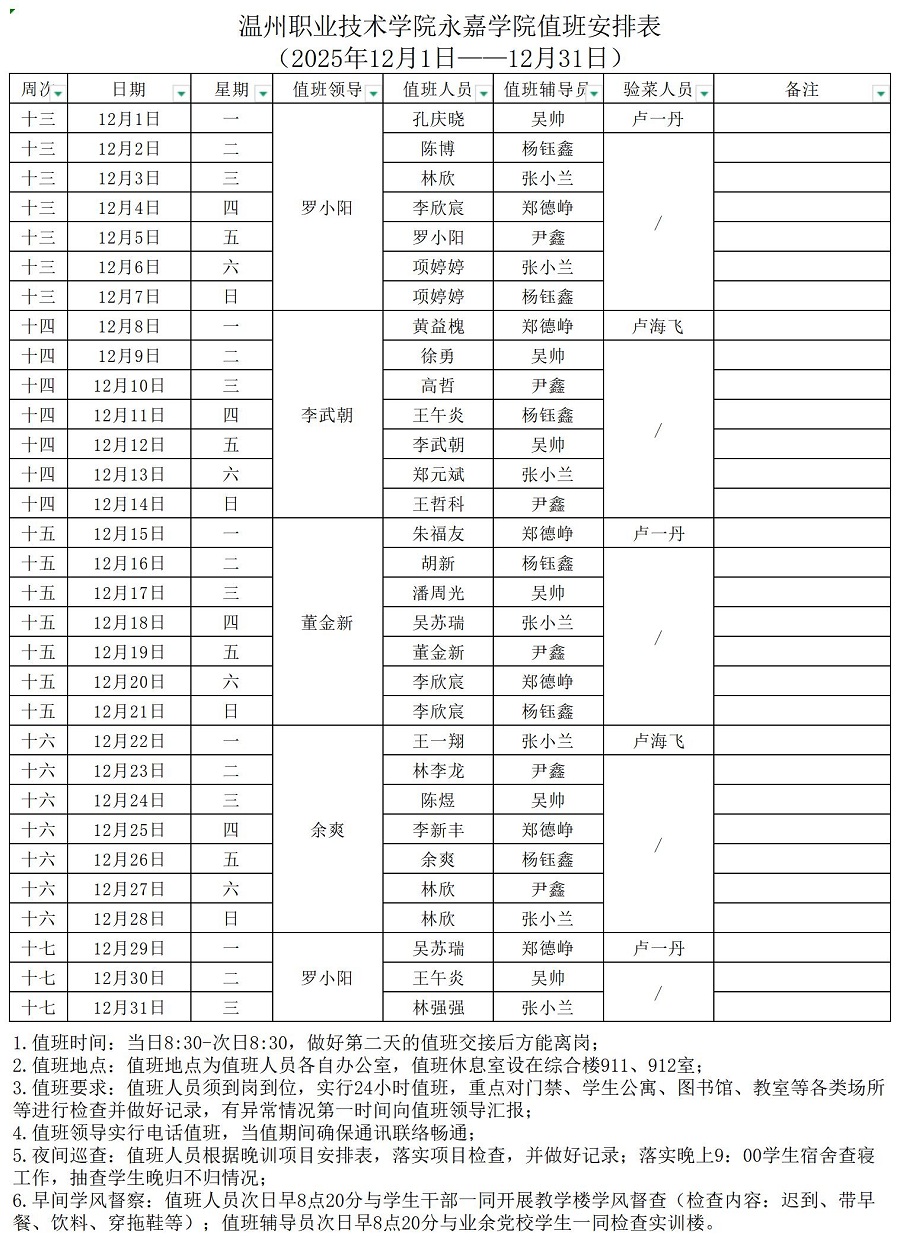 永嘉学院12月值班表(2025年12月1日-12月31日)