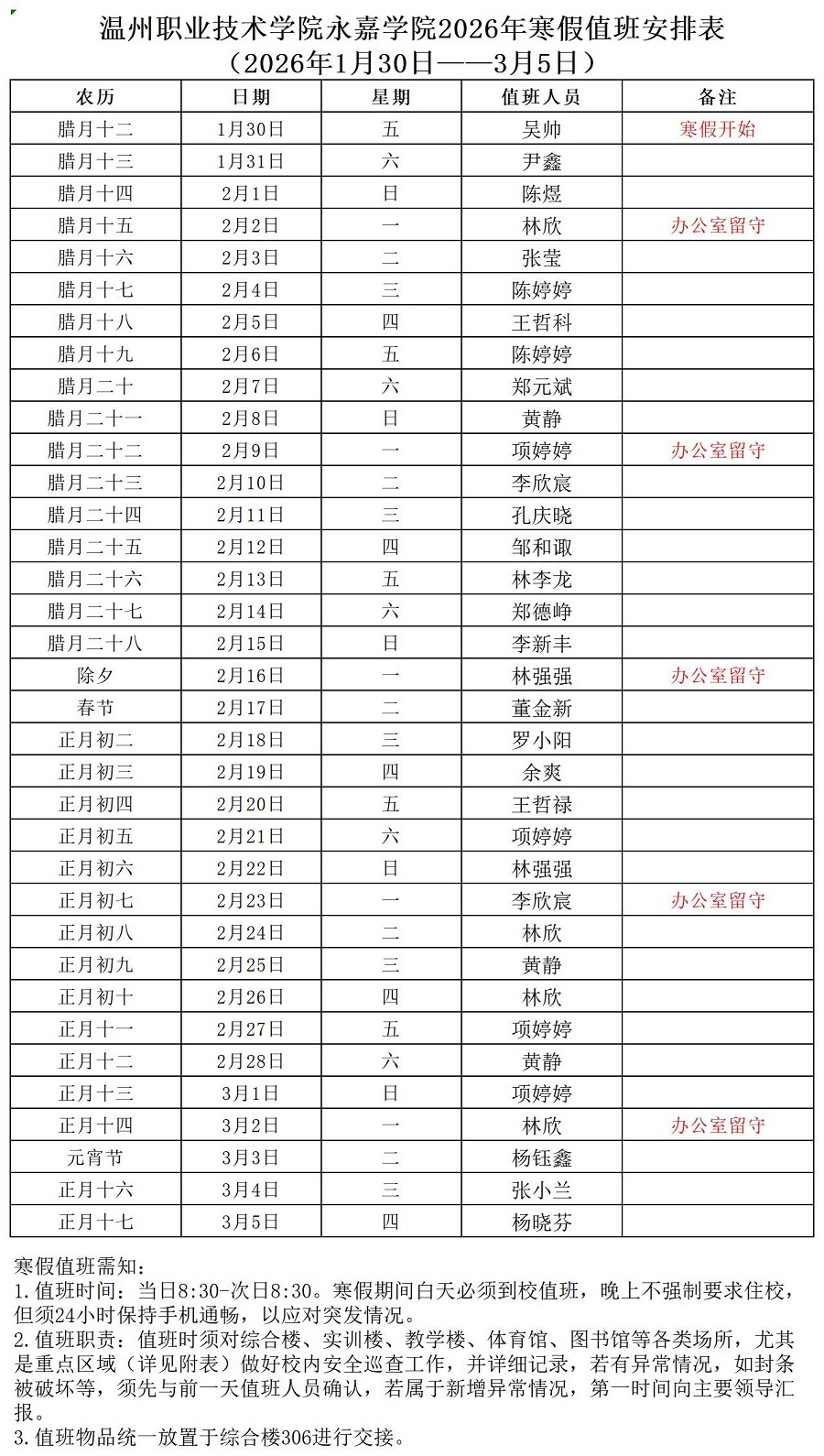 永嘉学院寒假值班表(2026年1月30日-3月5日)