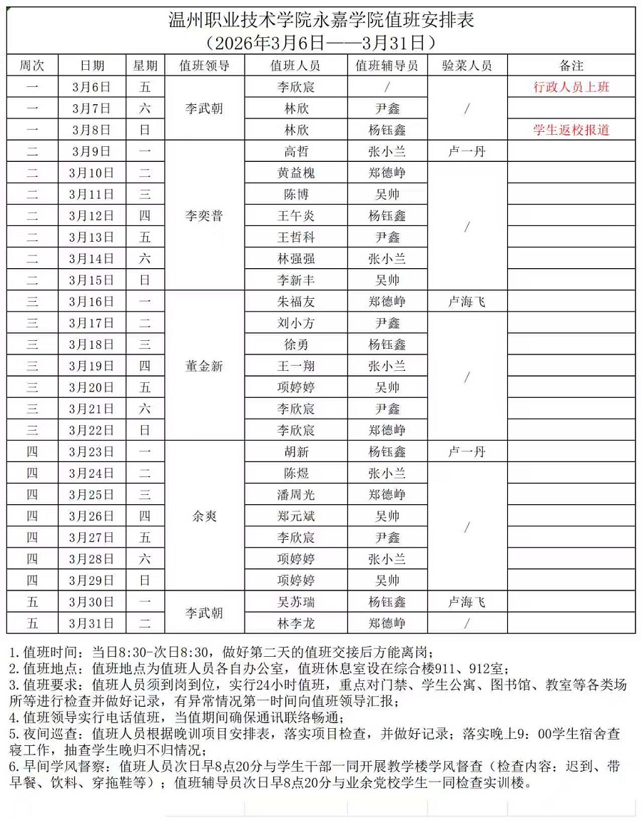 永嘉学院3月值班表(2026年3月6日-3月31日)