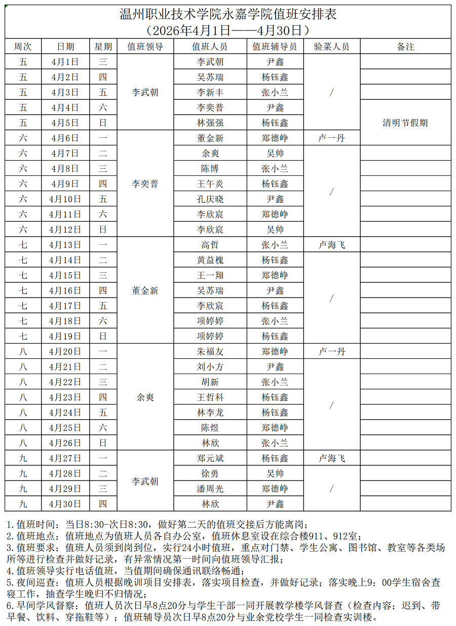 永嘉学院4月值班表(2026年4月1日-4月30日)